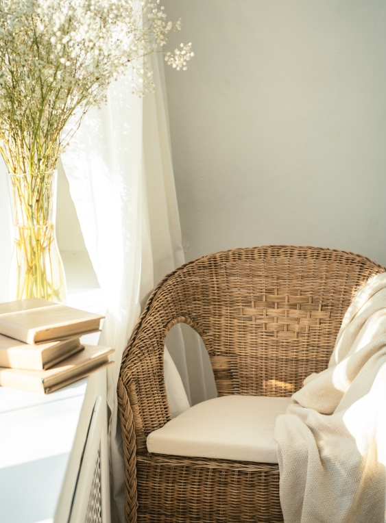 Curl up with a book in this cozy wicker chair and let all your book corner ideas come to life.